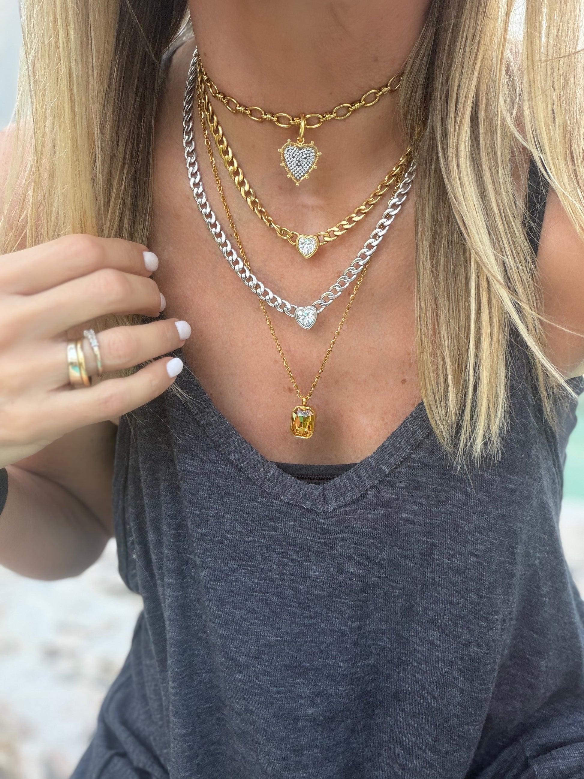 Stainless steel chain with zirconia black heart pendant. Length 17”.