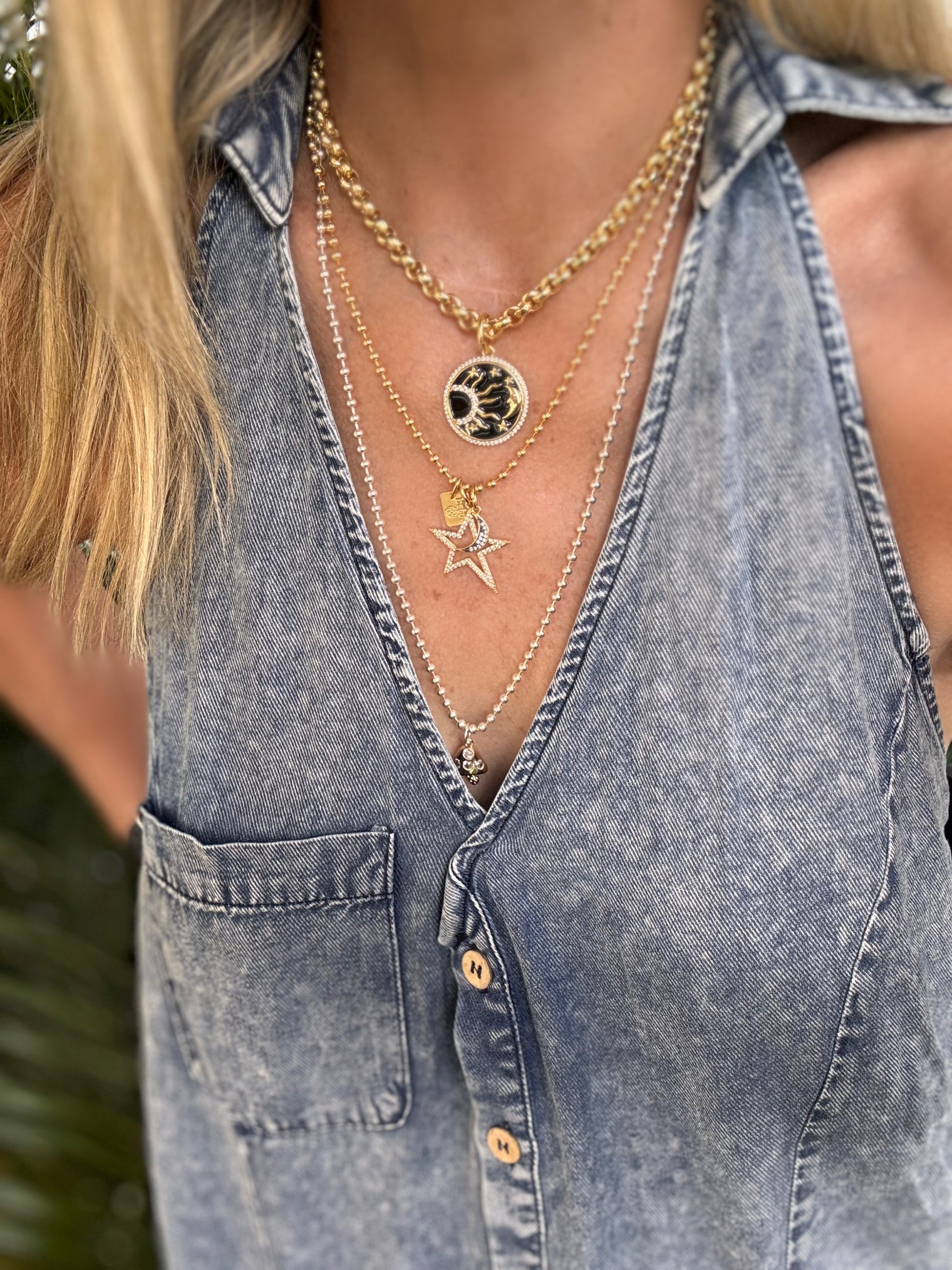 Gold rolo chain with enamel sun & moon pendant.