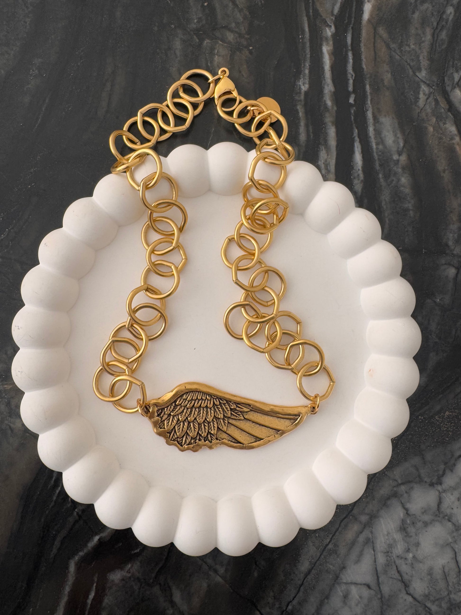 Steel, 12k Antiqued Gold Chain and Wing. Length 18"